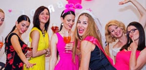 Cheerful bride and bridesmaids celebrating hen party with drinks