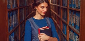 Student girl with books between bookshelves