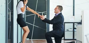 Young man romantically proposing to girlfriend and offering enga